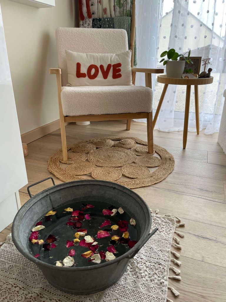 Laissez-vous aller par la chaleur du bain de pieds, les doux mouvements, la musique, l’huile et les odeurs...