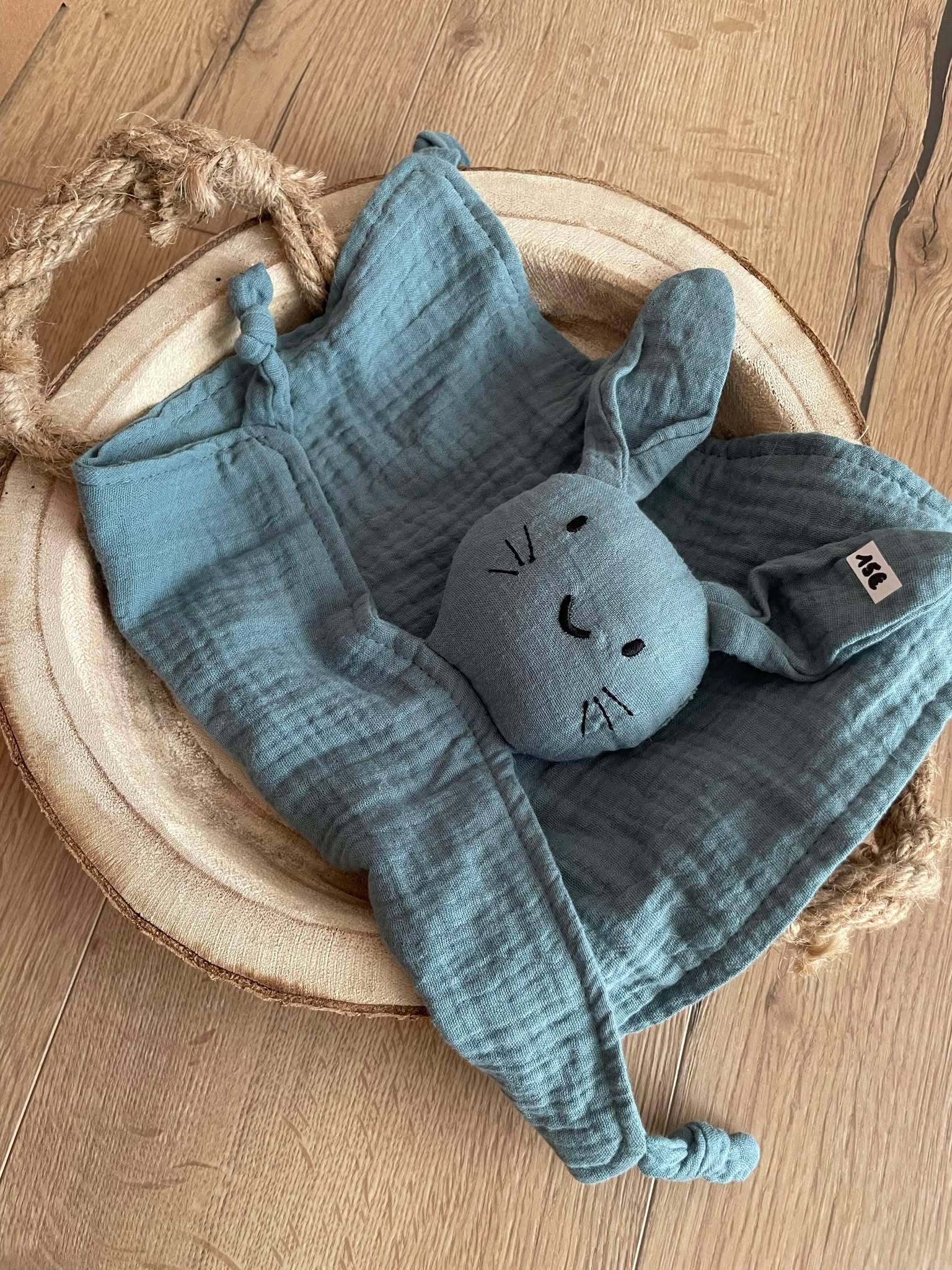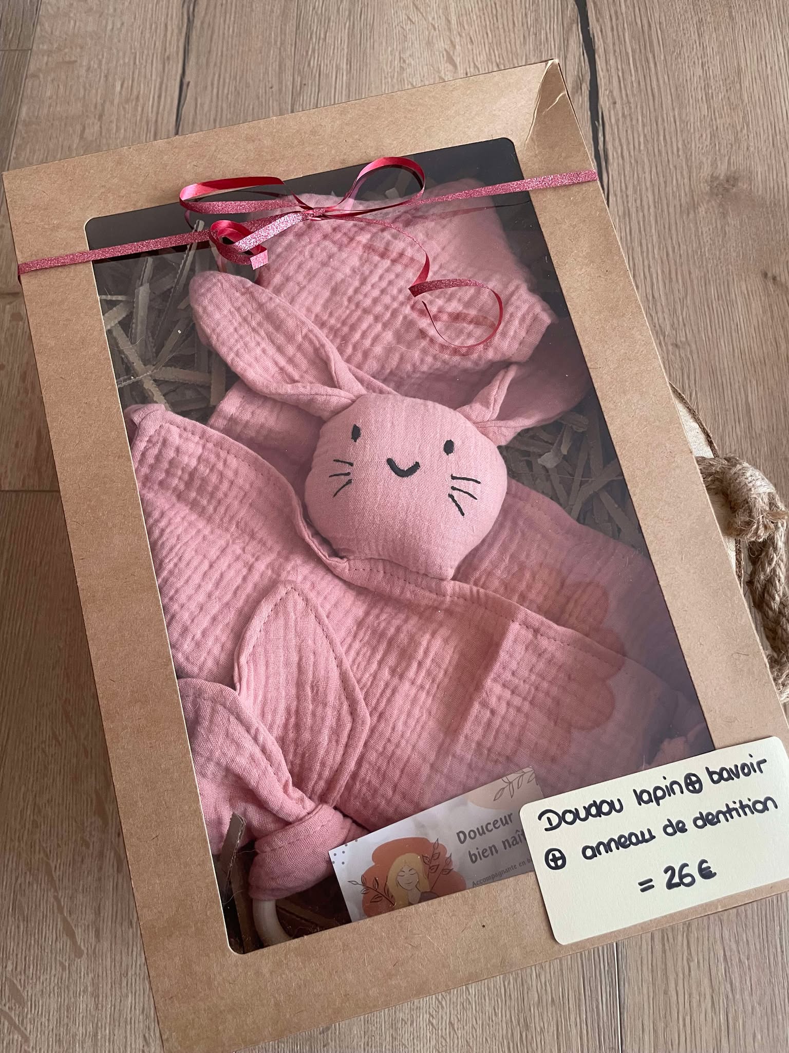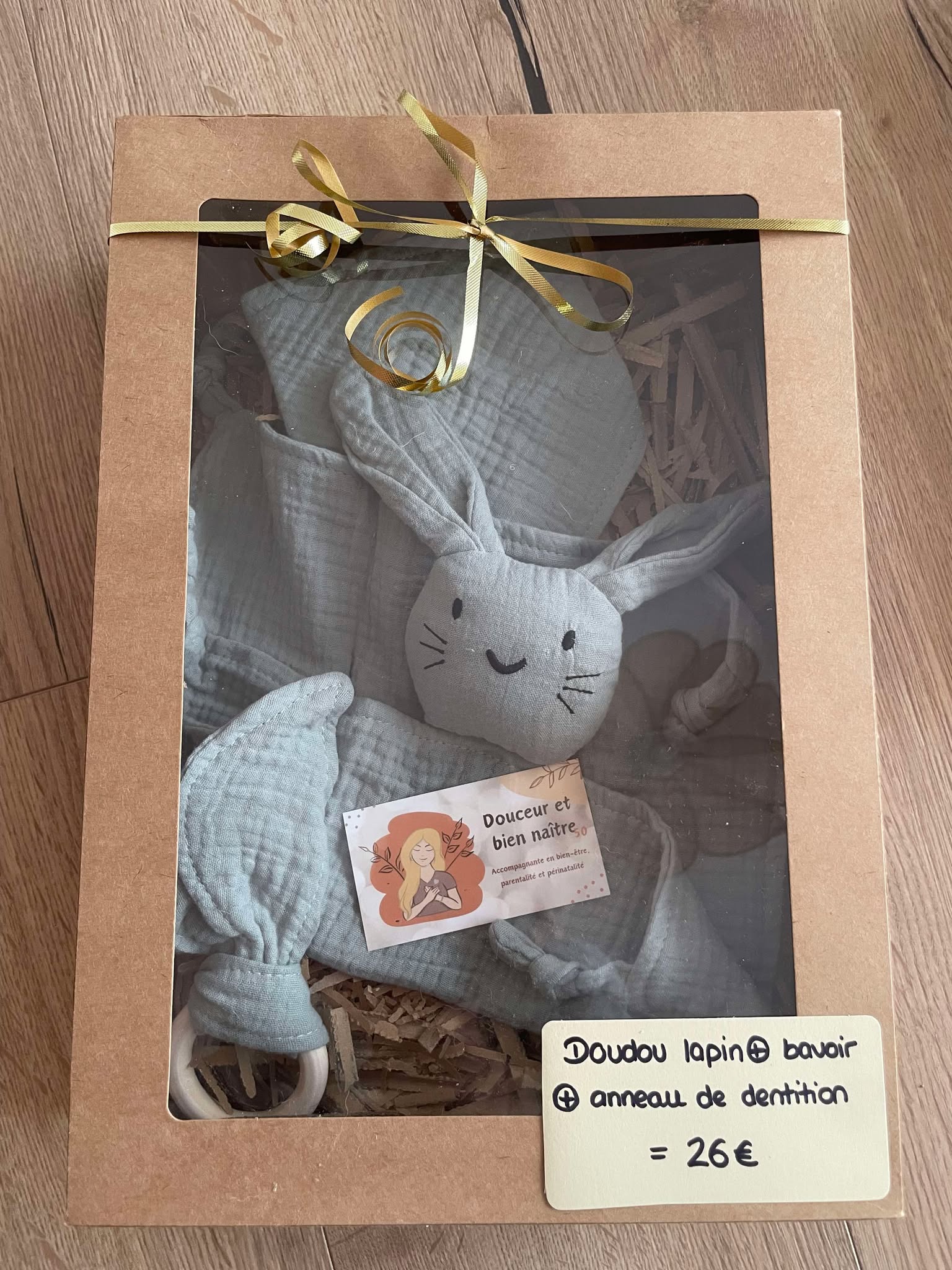 Un doudou lapin, un bavoir et un anneau de dentition en gaz de coton dans sa box en carton avec volet transparent.