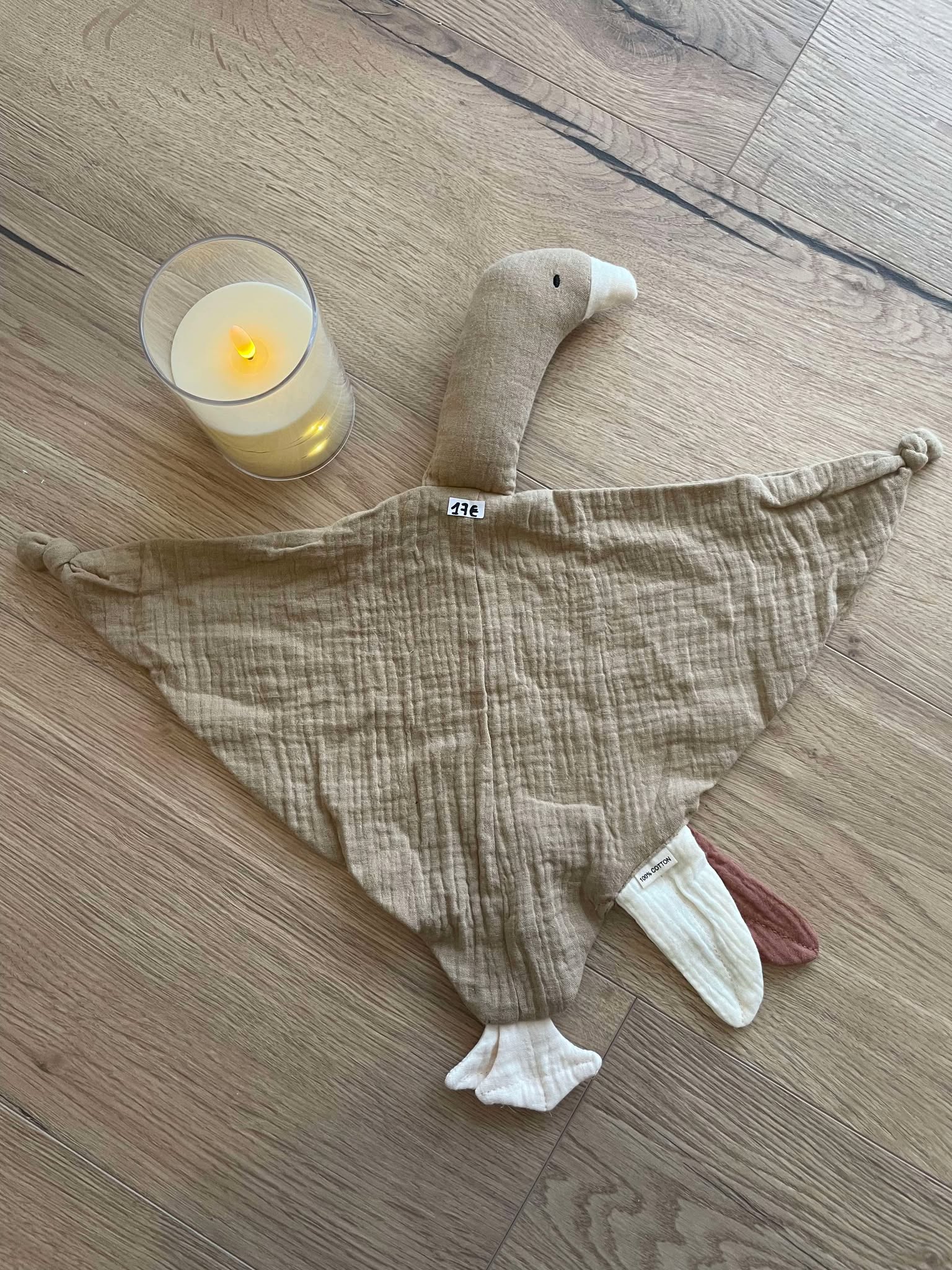 Un doudou oie en gaz de coton, un hochet en bois avec anneau en silicone jaune dans sa box en carton avec volet transparent.